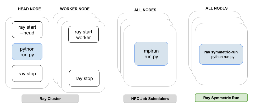 Ray now offers a simple solution: ray symmetric-run, a new way to run Ray jobs across all nodes in a cluster.