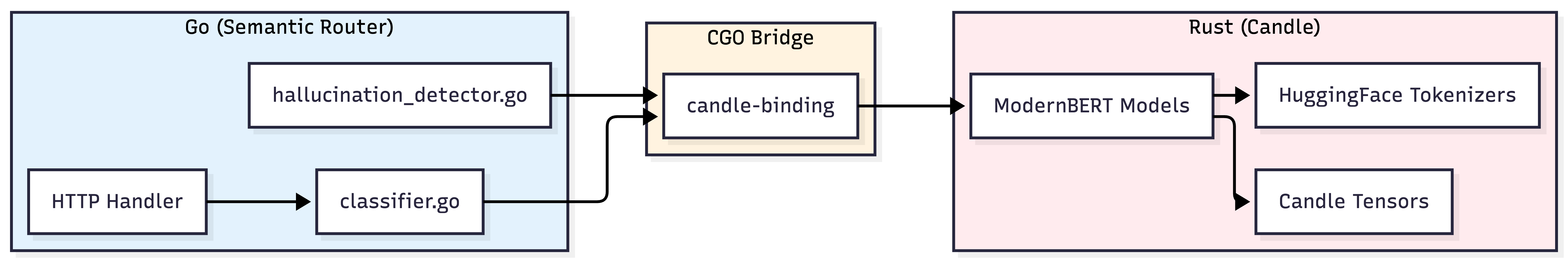 All three models run natively via Candle (Hugging Face’s Rust ML framework) with CGO bindings to Go: